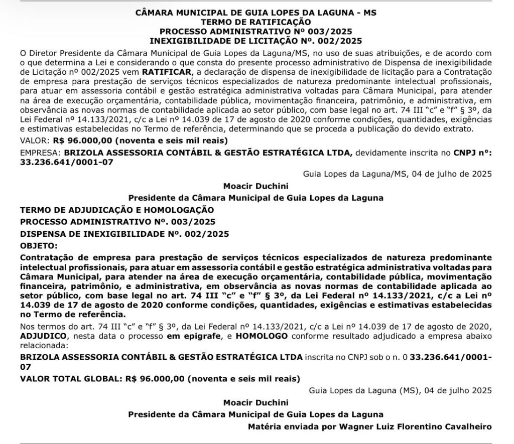 Home » Publicações » TERMO DE RATIFICAÇÃOPROCESSO ADMINISTRATIVO Nº 003/2025 INEXIGIBILIDADE DE LICITAÇÃO Nº. 002/2025
