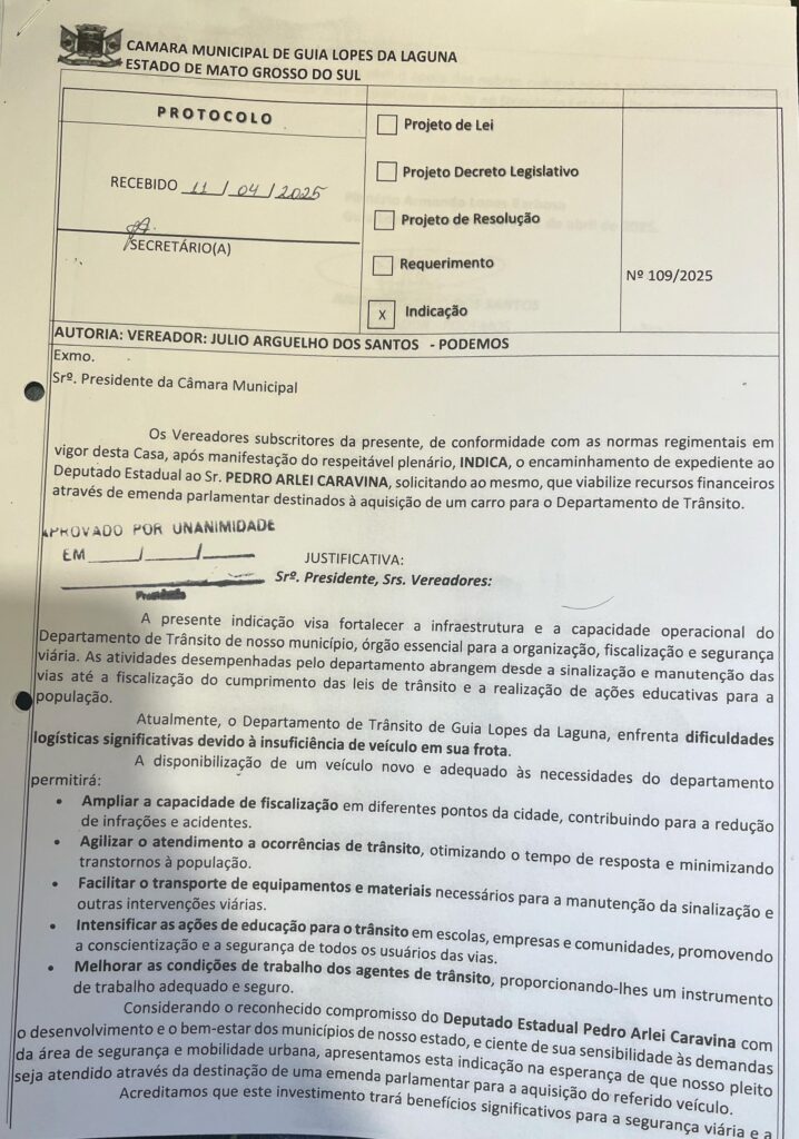 O vereador Julio Arguelho solicito emenda parlementar ao Dep. Estadual Pedro Arlei Caravina para ser destinada a aquisição de veículo para o Departamento de Trânsito.